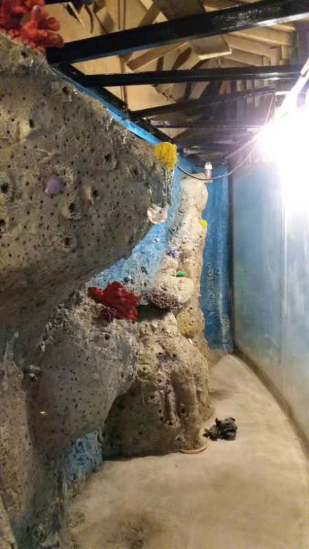 制作仿真珊瑚礁巖目前應用最多的是兩種方法:一種是采用水泥砂石堆砌造型,面層仿真處理。這種方法的特點是造價較低,造型隨意;缺點是自重很重,對建筑承載力要求較高,放水泡缸時間要求很長,對水質的影響較大,只有一部分場館采用這種方法。另一種方法是采用真實珊瑚礁玻璃鋼翻模的方法,這種方法的特點是:表現力真實細膩,生態(tài)環(huán)保自重輕,對建筑物承載力無過高要求:缺點是造價相對第一種高。大多數場館采用這用造景方式,實踐證明,第二種方法雖然初始投資高了些,但效果好,加上材料結實耐用,長期使用維護成本低,綜合經濟指標比第一種方法要好,所以受到了大部分客戶的歡迎。